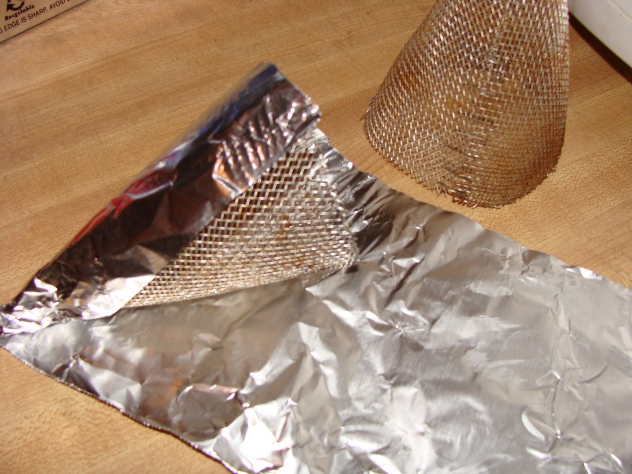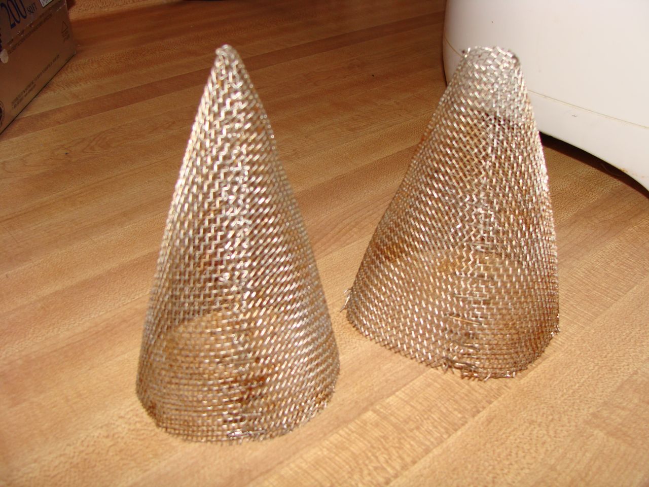 I created the bacone forms by cutting up a strainer and rolling them into cone shapes and stapling them. One cone is smaller than the other. The bacon is sandwiched between the two forms when frying.